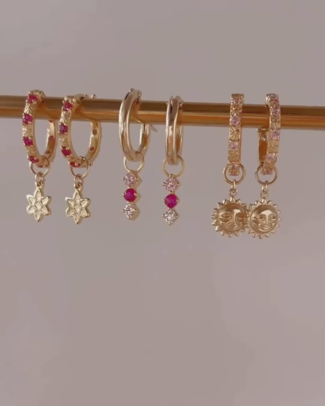 The Asteria Crimson Hoop Earrings Set is designed to bring a bold pop of colour to your collection. The Asteria Crystal Hoops feature clear crystals stones, offering a classic appeal. The Crimson Tri Hoops pair our Classic Mini Euro Hoops with removable charms showcasing a trio of crystals in tourmaline pink, ruby red, and sparkling white—perfect for adding a colourful, elegant twist to your look. Versatile and eye-catching, these hoops are ideal for making a statement every day.